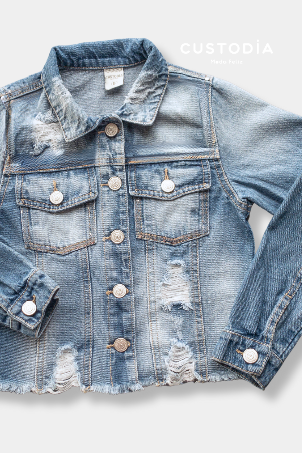 Una chaqueta siempre será un infaltable en el closet de nuestras niñas, y esta hermosa chaqueta con proceso y desgaste hace que sus looks se vean geniales.