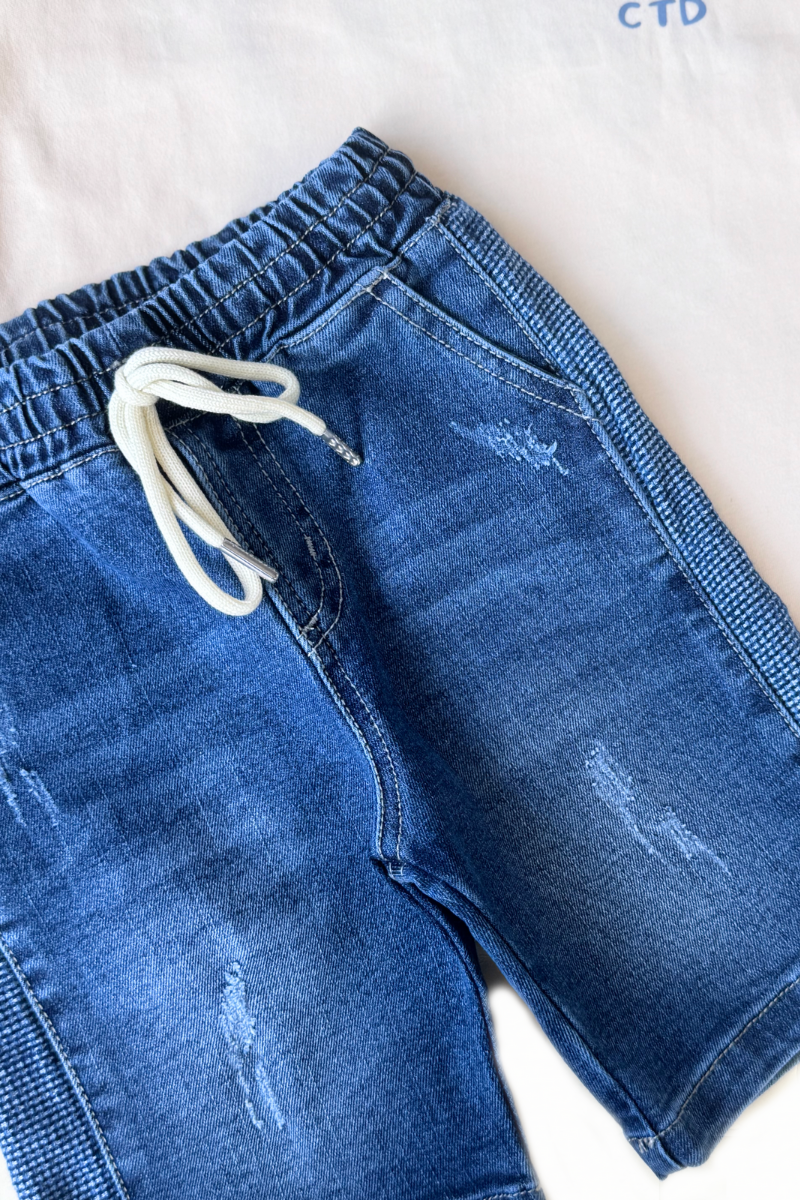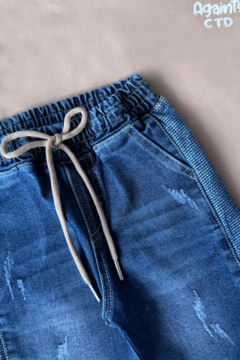 - Bermuda de jean con desgastes y con cordón ajustable.