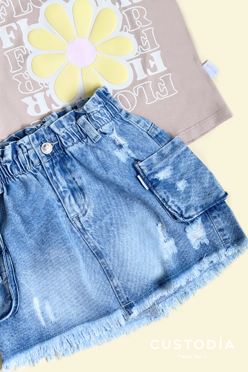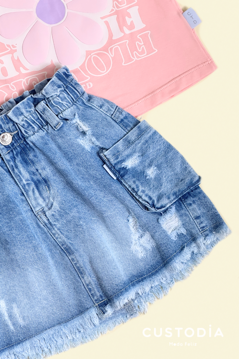 Diseñado para las niñas que quieren destacar, nuestro set de falda Jean y Camiseta es ideal para salir y estar en familia. ¡Un look con mucha personalidad y encanto!.